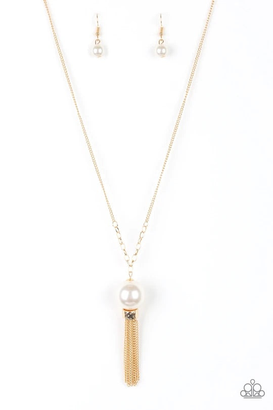 A dramatic pearly white bead swings from the bottom of an elegantly elongated gold chain. Featuring a hammered fitting, a gold tassel streams from the bottom of the colorful pendant for a refined finish. Features an adjustable clasp closure.