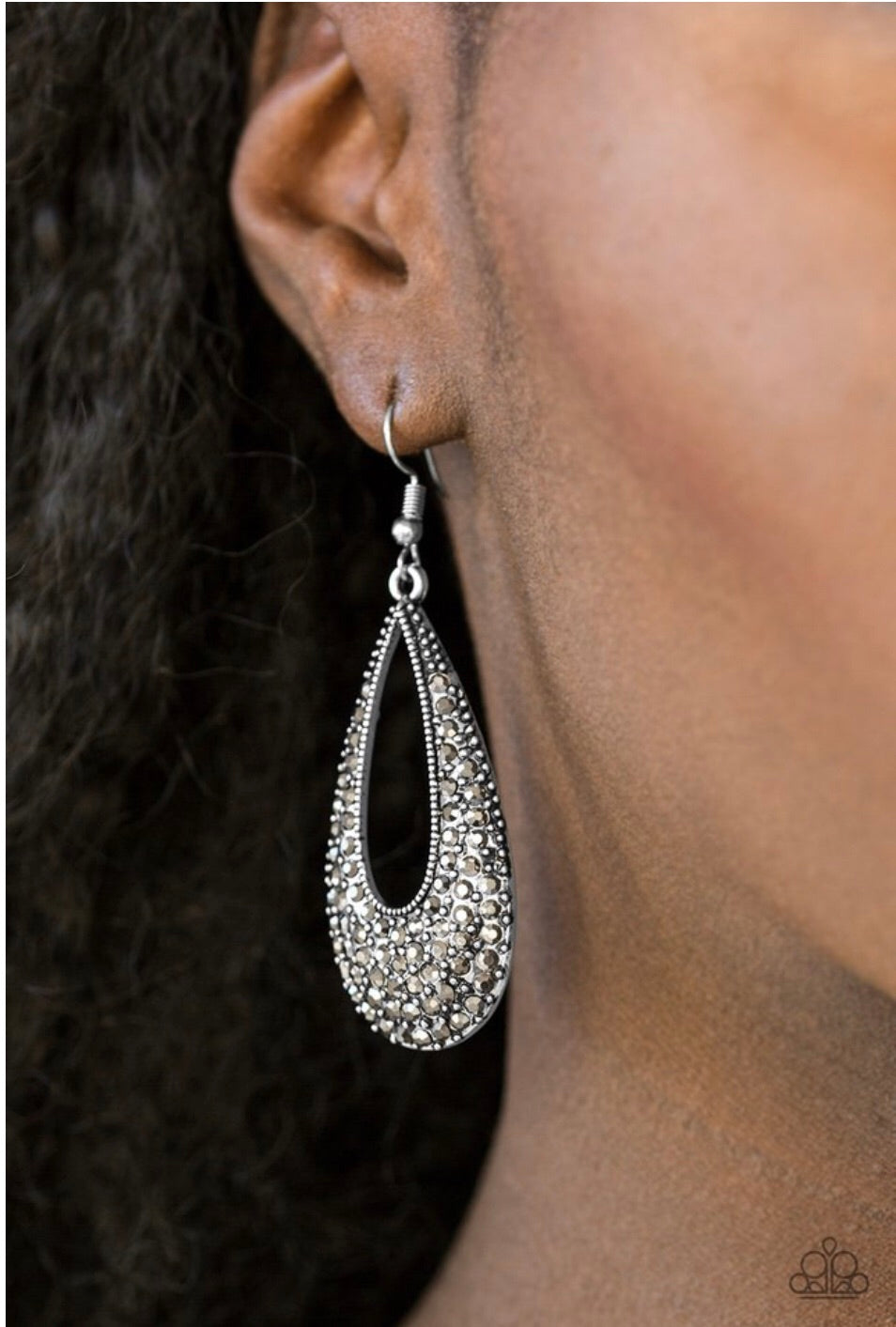 As if dipped in glitter, an airy teardrop lure is encrusted in row after row of glittery hematite rhinestones for a dramatic look. Earring attaches to a standard fishhook fitting.