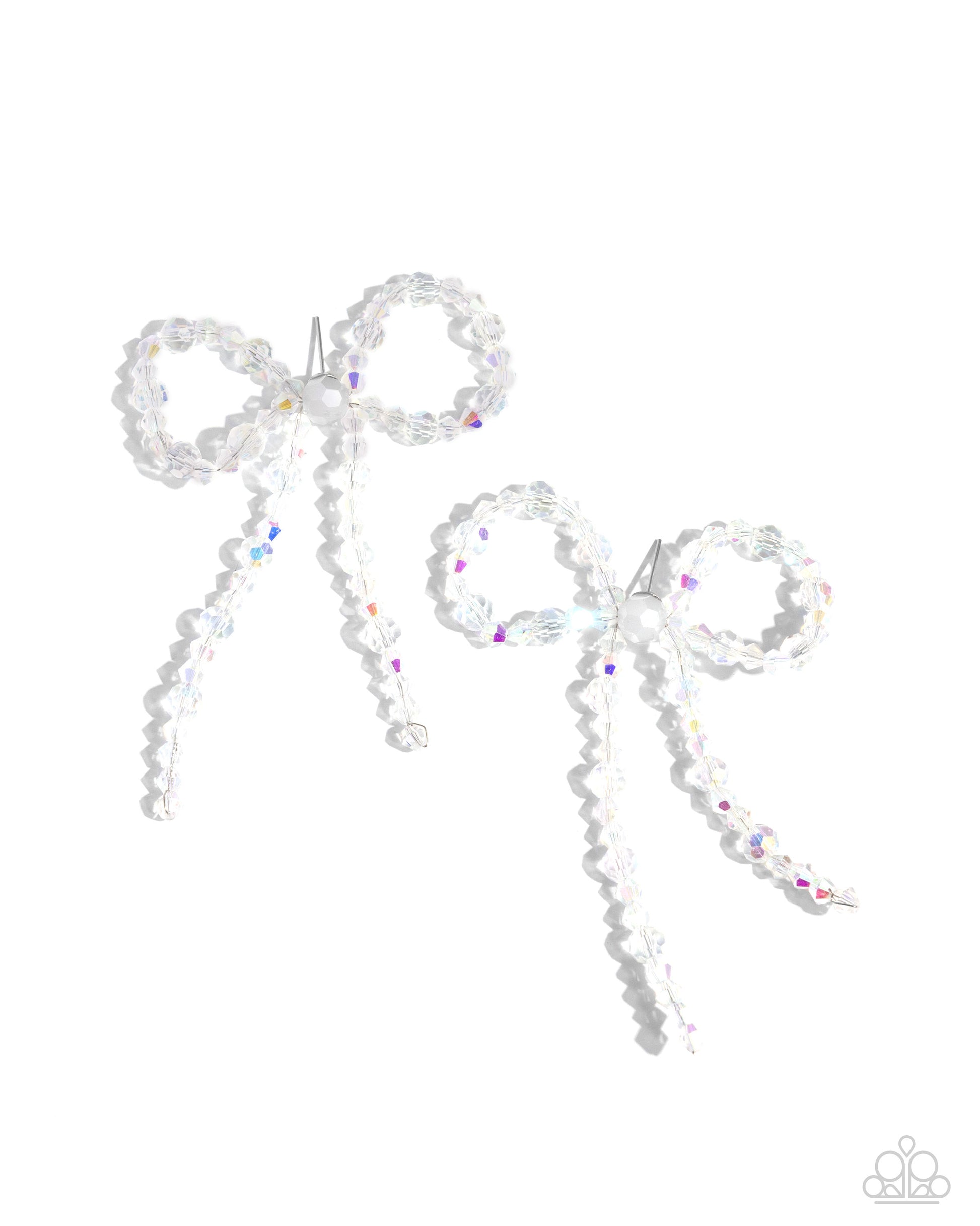Infused along an invisible wire, faceted clear iridescent high-sheen beads curl and loop into a stunning bow, creating a classy statement at the ear. Earring attaches to a standard post fitting. Due to its prismatic palette, color may vary.