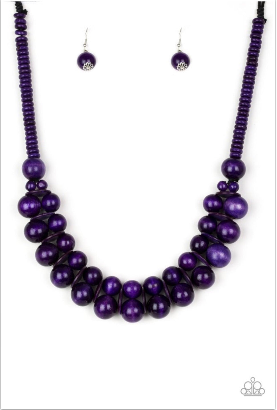 Brushed in a distressed finish, vivacious purple wooden beads and discs join below the collar for a summery look. Features a button loop closure.