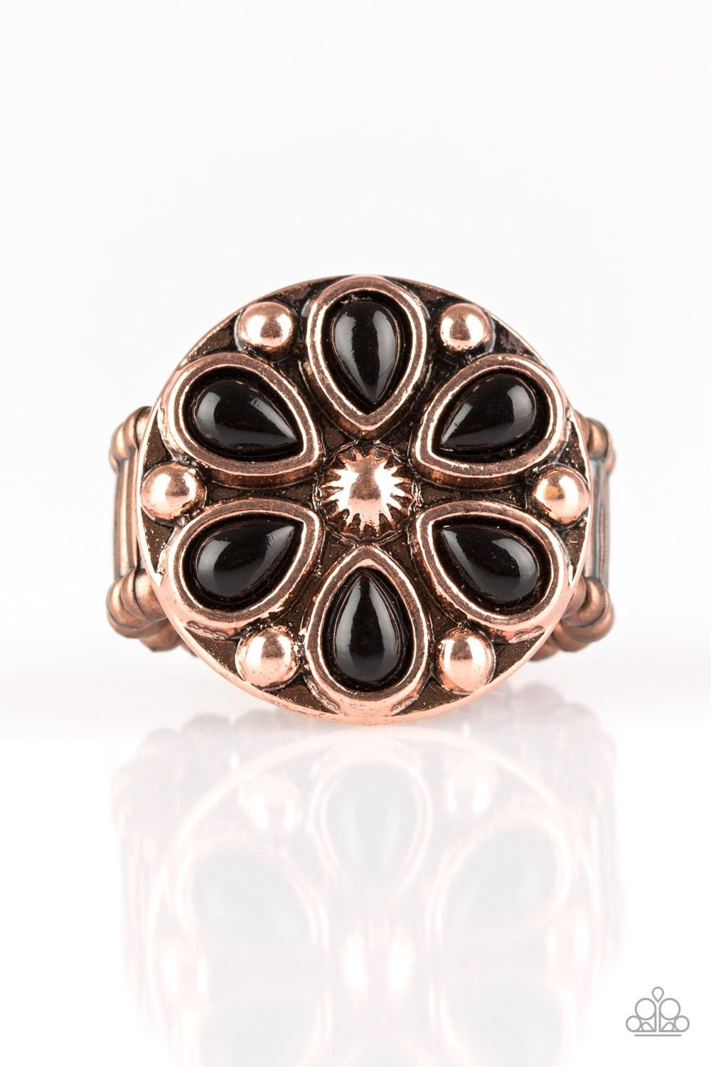 Polished black beads are pressed into a studded copper frame, creating a colorful floral centerpiece atop the finger. Features a stretchy band for a flexible fit.