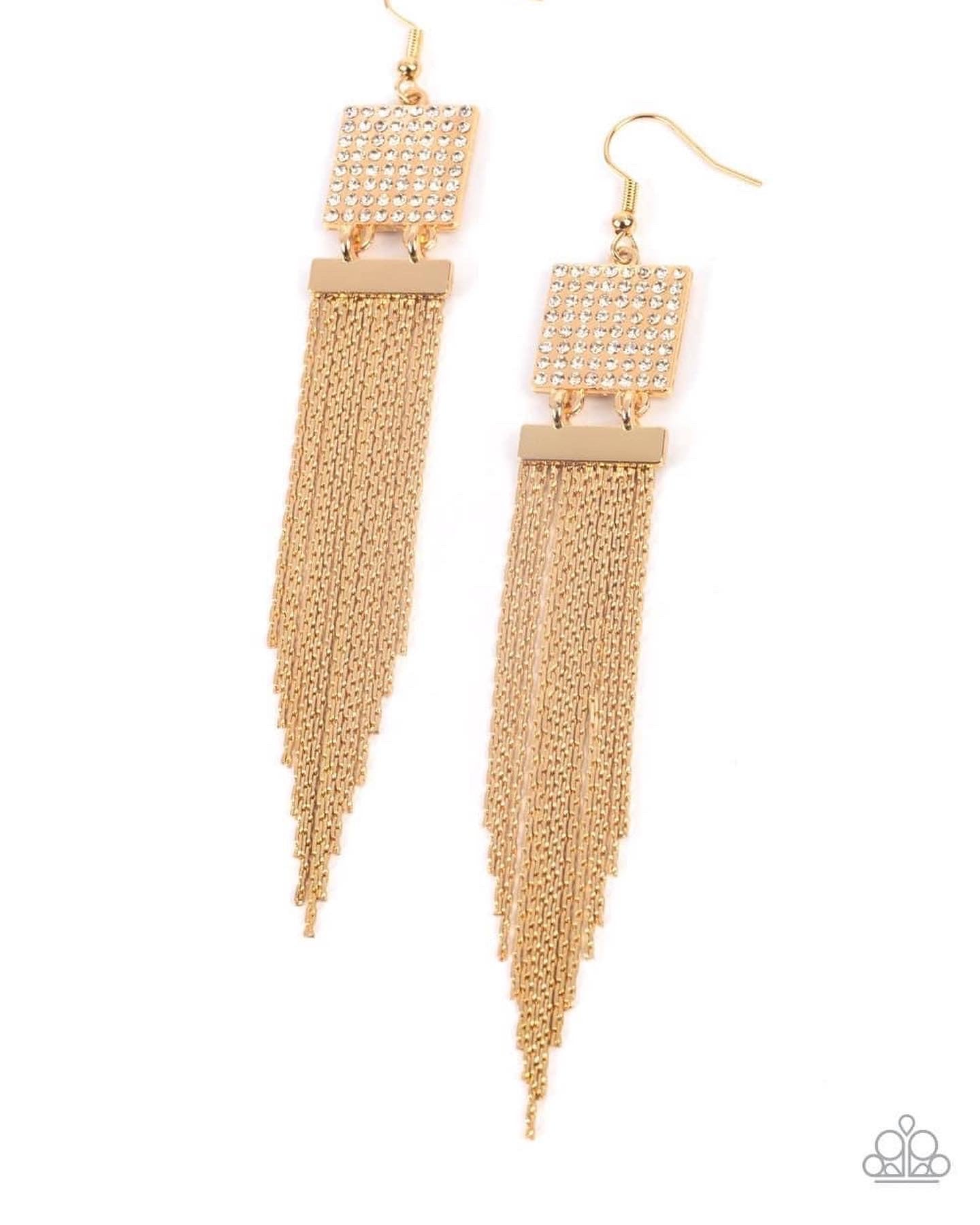 Rhinestones adorn a shimmering, gold square and dainty white gold chains trickle down, creating a romantic chandelier. Earring attaches to a standard fishhook fitting.