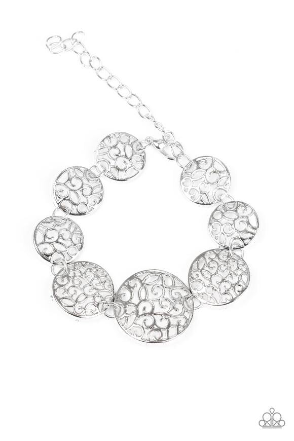 Filled with whirling filigree centers, shiny silver frames link around the wrist for a whimsical look. Features an adjustable clasp closure.