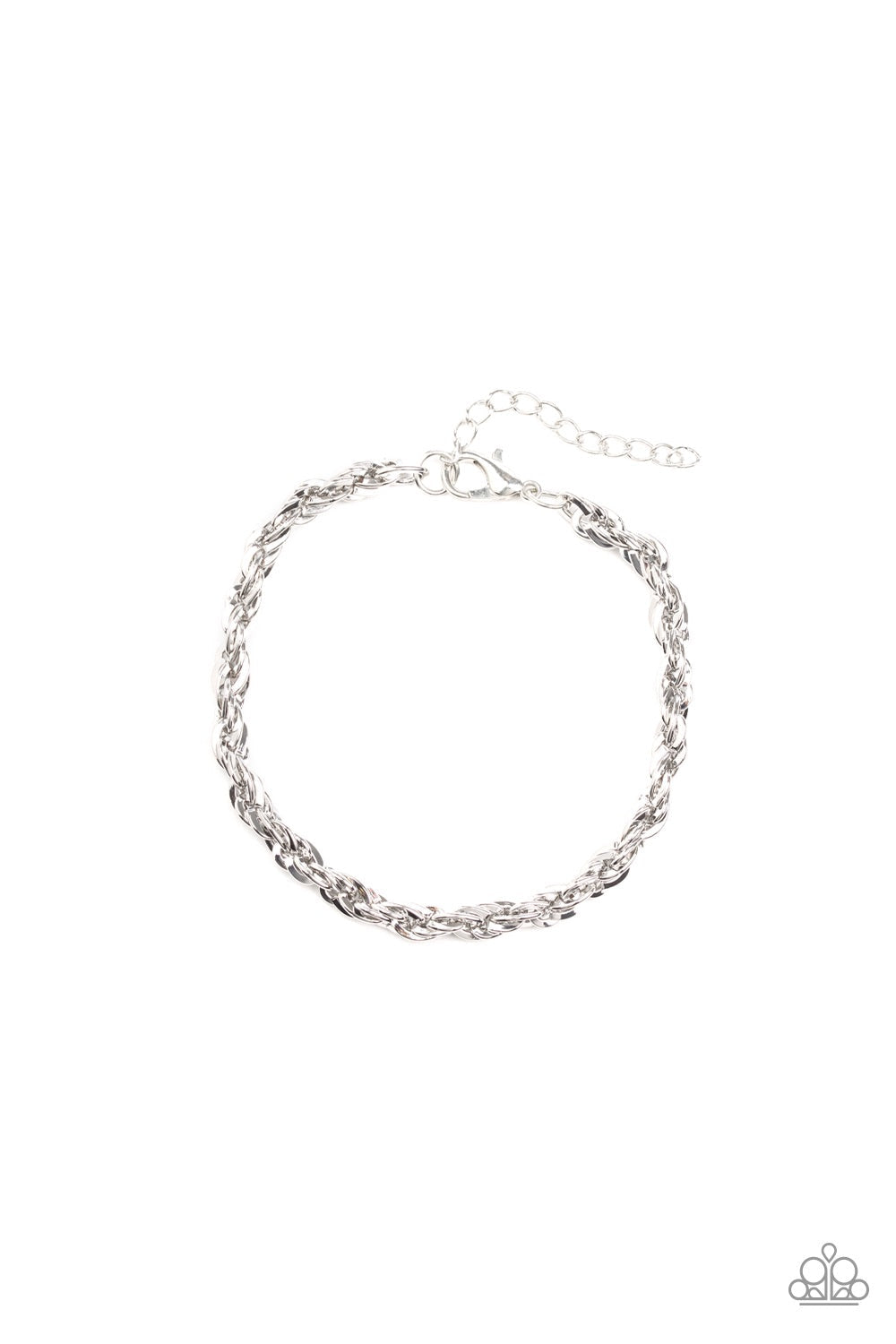 Brushed in a high-sheen finish, a silver double rope chain wraps around the wrist for a casual look. Features an adjustable clasp closure.