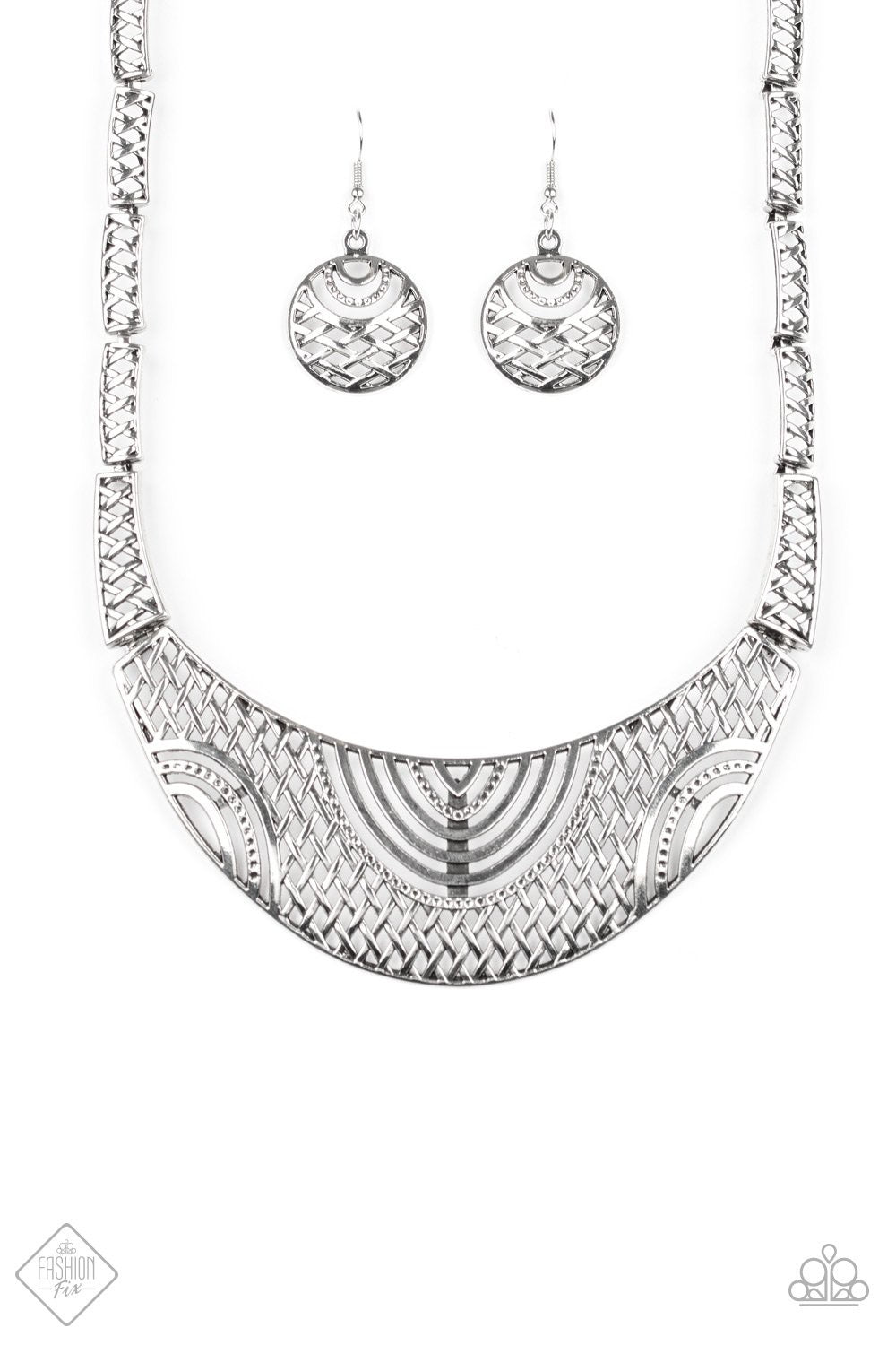 Necklace: " On The MANE Stage" (P2ST-SVXX-095RY)- Featuring crisscrossed detail, dainty silver frames link below the collar, giving way to a dramatic half-moon plate radiating with dizzying tribal details for a fierce look. Features an adjustable clasp closure.