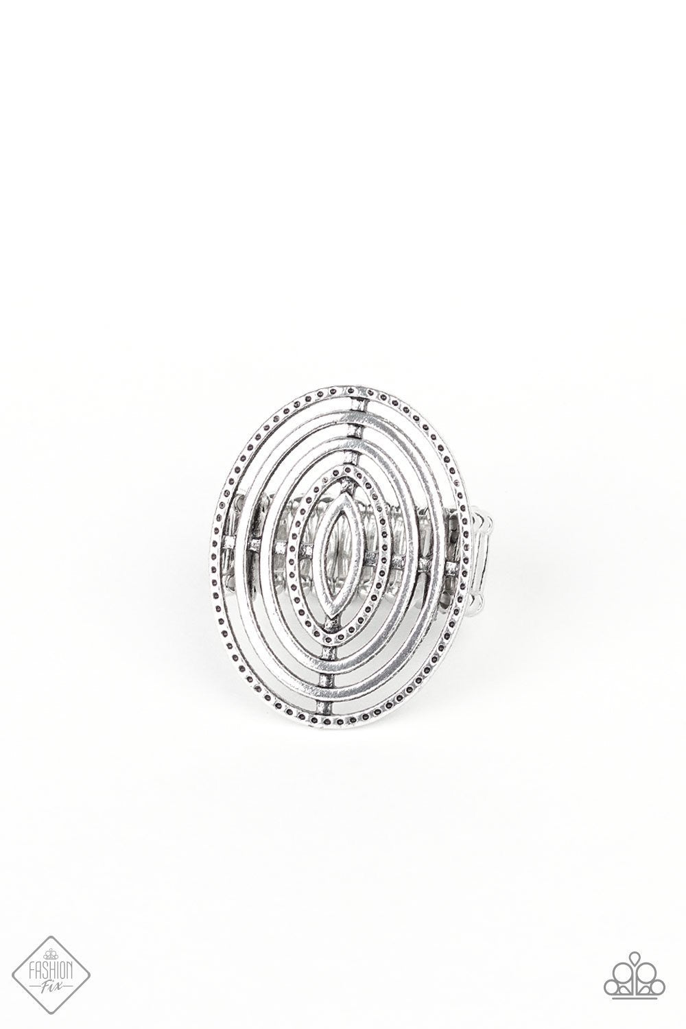 Ring: "Center Target" (P4TR-SVXX-068RY)- Featuring smooth and hammered finishes, antiqued silver frames ripple out into a dizzying centerpiece atop the finger. Features a stretchy band for a flexible fit.