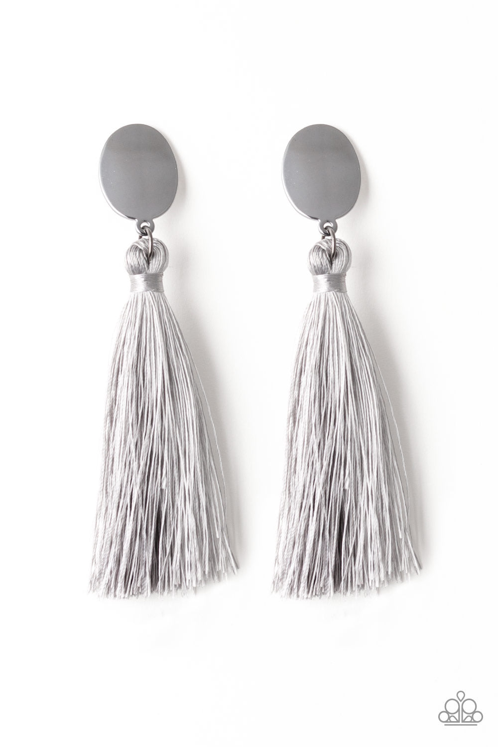 A plume of shiny gray thread streams from the bottom of a glistening gunmetal frame, creating a dramatically tasseled look. Earring attaches to a standard post fitting.